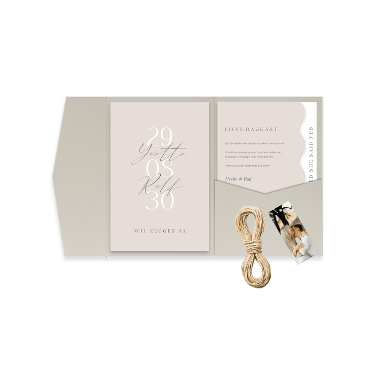 Op zoek naar een bijzondere trouwkaart? Deze pocketfold* trouwkaart bestaat uit meerdere losse kaarten die je samen kunt bewerken in de online editor. De beige kleur in combinatie met de golvende rand maken deze kaart niet alleen elegant maar ook trendy. Pas kleuren en typografie naar wens aan in de editor en bestel een proefdruk.