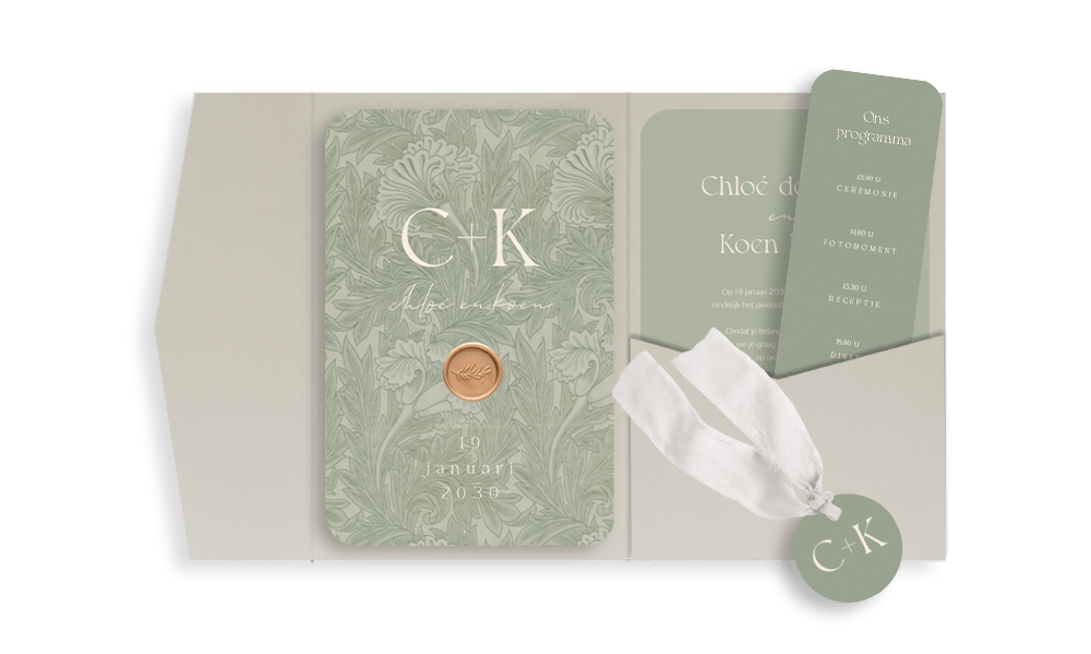 Een stijlvolle pocketfold trouwkaart in een prachtige groene kleur. Op de kaart zie je een mooi botanisch patroon. Daarnaast kan je de kaart verrijken met een lakzegel. Pas het ontwerp gemakkelijk aan in onze editor.