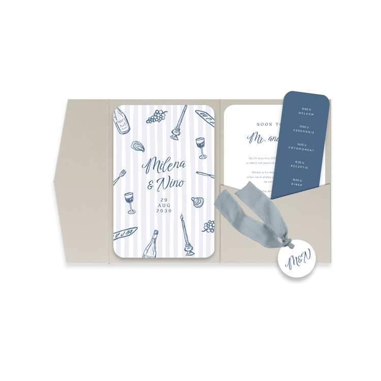 Trouwkaart pocketfold met blauwe getekende illustraties