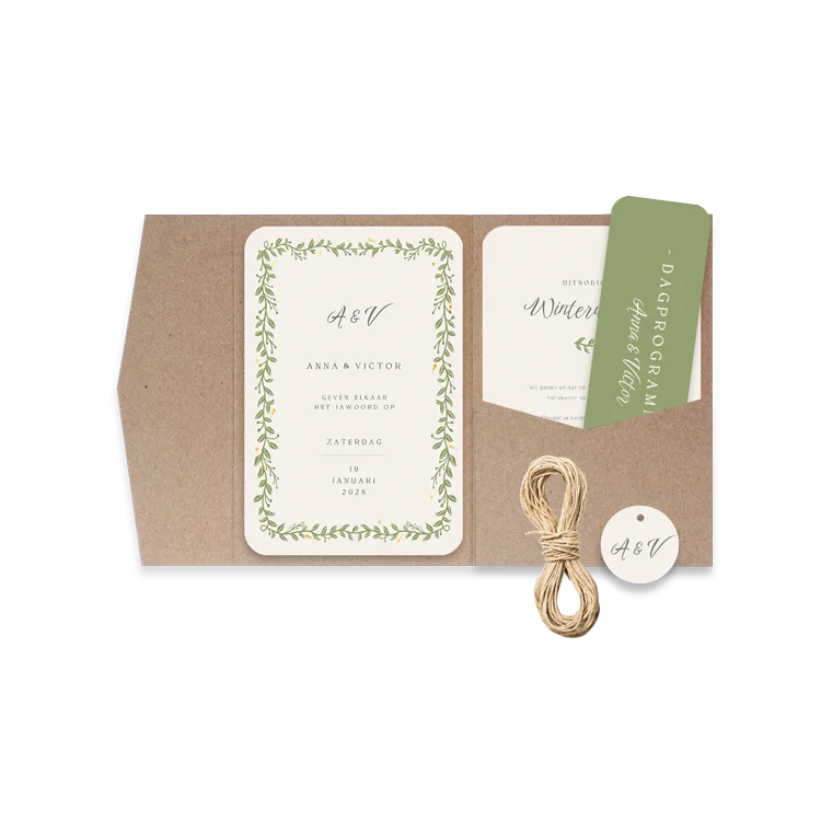 Een pocketfold trouwkaart: hoe werkt het?Plaats zelf de teksten en elementen eenvoudig op de juiste plek in onze opmaaktool. Heb je hier hulp bij nodig? Neem gerust even contact met ons op!
