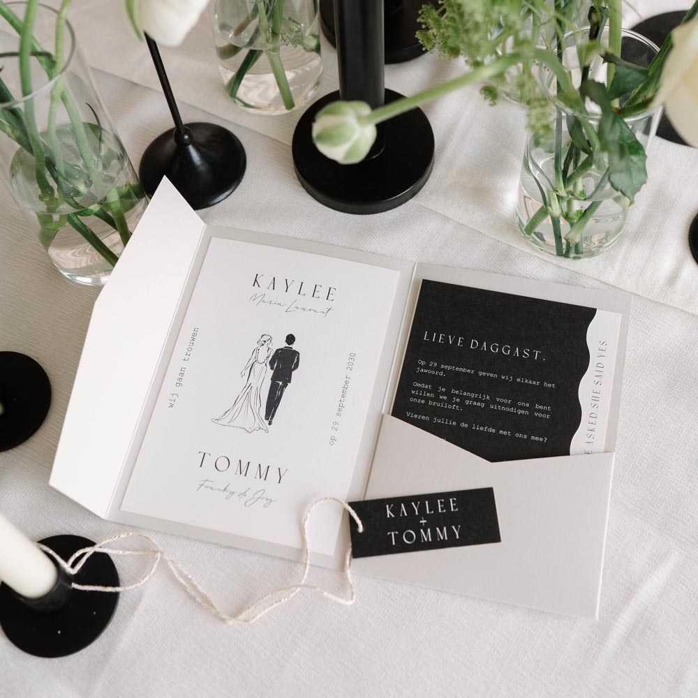 Op zoek naar een bijzondere trouwkaart? Deze pocketfold* trouwkaart bestaat uit meerdere losse kaarten die je samen kunt bewerken in de online editor. Het zwart witte ontwerp in combinatie met de golvende rand maken deze kaart niet alleen elegant, maar ook trendy. Pas kleuren en typografie naar wens aan in de editor en bestel een proefdruk.