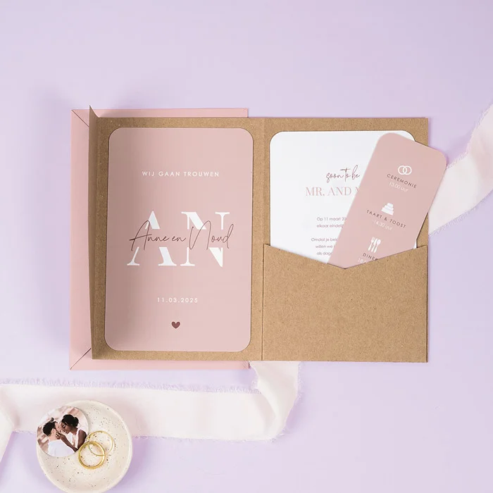 Een pocketfold trouwkaart: hoe werkt het?Plaats zelf de teksten en elementen eenvoudig op de juiste plek in onze opmaaktool. Heb je hier hulp bij nodig? Neem gerust even contact met ons op!