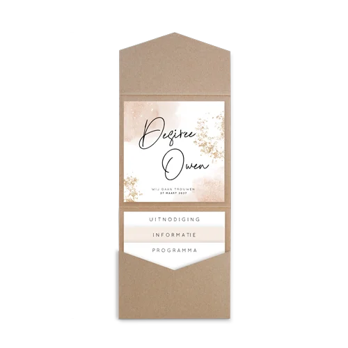 Een pocketfold trouwkaart: hoe werkt het?Plaats zelf de teksten en elementen eenvoudig op de juiste plek in onze opmaaktool. Heb je hier hulp bij nodig? Neem gerust even contact met ons op!
