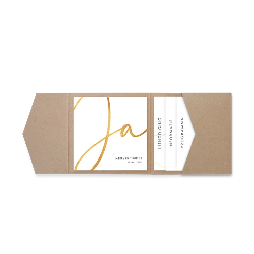 Een pocketfold trouwkaart: hoe werkt het?Plaats zelf de teksten en elementen eenvoudig op de juiste plek in onze opmaaktool. Heb je hier hulp bij nodig? Neem gerust even contact met ons op!