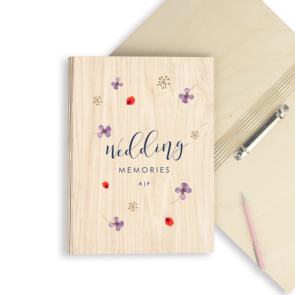 Deze bewaarbundel met gedroogde bloemen is gemaakt van multiplex hout in A4 formaat en heeft een accordeon rug. Je kunt de voorzijde van de bundel naar wens personaliseren in de editor. Onwijs leuk voor het bewaren van alle huwelijks felicitatiekaarten en bijvoorbeeld de trouwakte.