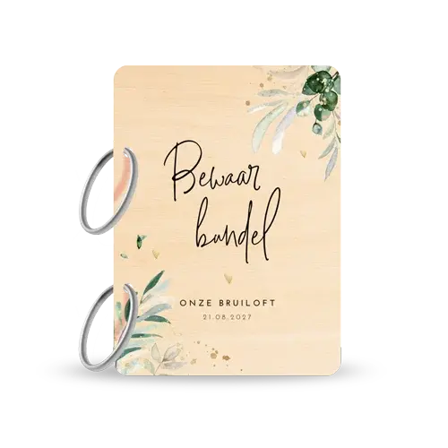 Deze botanische bewaarbundel met gouden elementen is gemaakt van multiplex hout, heeft afgeronde hoeken en twee metalen ringen. Je kunt de voorzijde van de bundel naar wens personaliseren in de editor. Onwijs leuk voor het bewaren van alle huwelijks felicitatiekaarten van jullie geliefden.