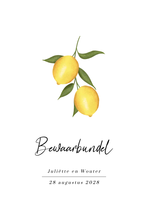 Deze stijlvolle bewaarbundel met citroen is gemaakt van multiplex hout, heeft afgeronde hoeken en twee metalen ringen. Je kunt de voorzijde van de bundel naar wens personaliseren in de editor. Onwijs leuk voor het bewaren van alle huwelijks felicitatiekaarten van jullie geliefden.