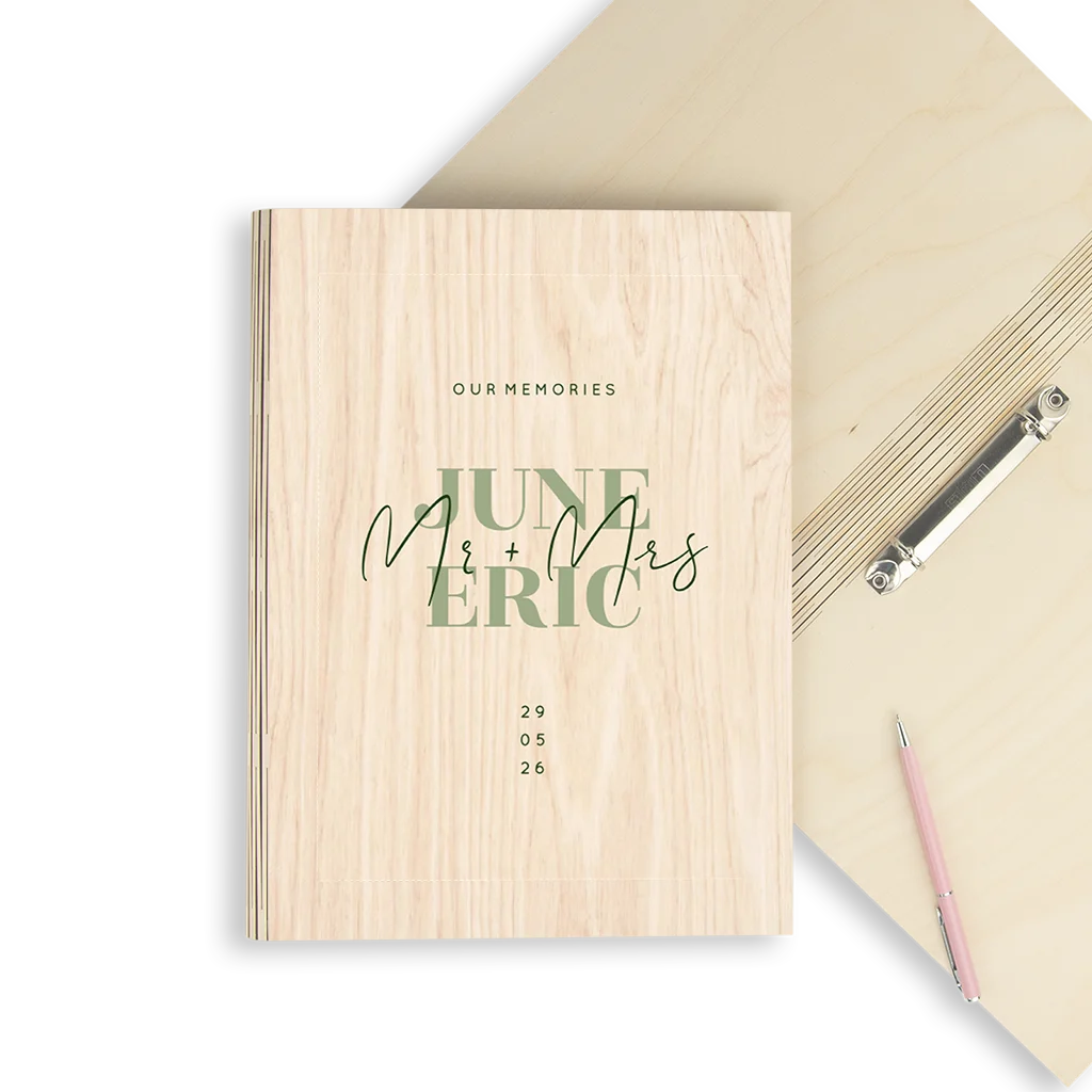 Deze bewaarbundel met tekst is gemaakt van multiplex hout in A4 formaat en heeft een accordeon rug. Je kunt de voorzijde van de bundel naar wens personaliseren in de editor. Onwijs leuk voor het bewaren van alle huwelijks felicitatiekaarten en bijvoorbeeld de trouwakte.