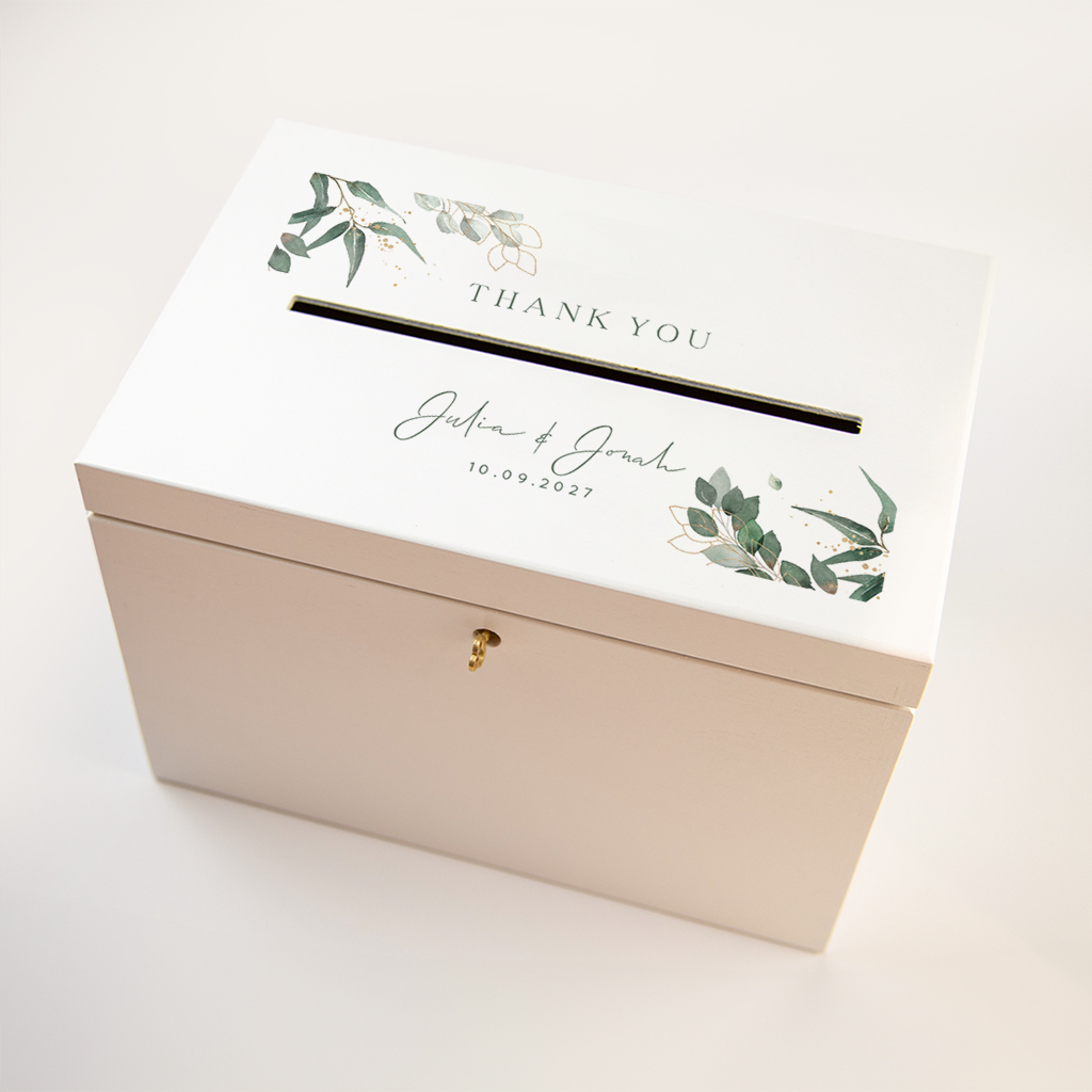 Botanische enveloppenkist bruiloft met water color en gouden details