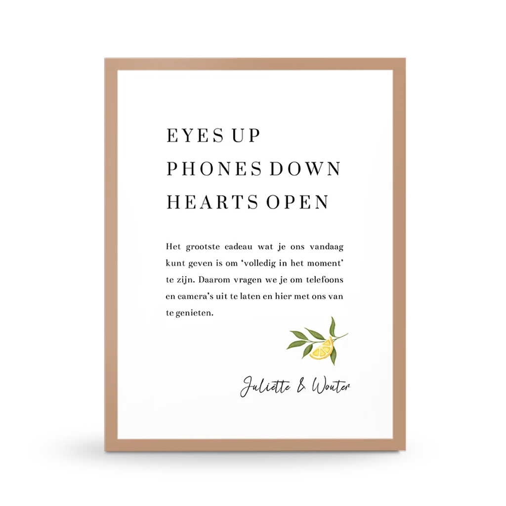 Willen jullie de gasten laten weten dat het een unplugged wedding, oftewel een telefoon vrije bruiloft of ceremonie is? Lijst deze poster dan in en hang 'm op of zet 'm neer in de buurt van de ingang. Zo kunnen jullie samen volledig van het moment genieten!