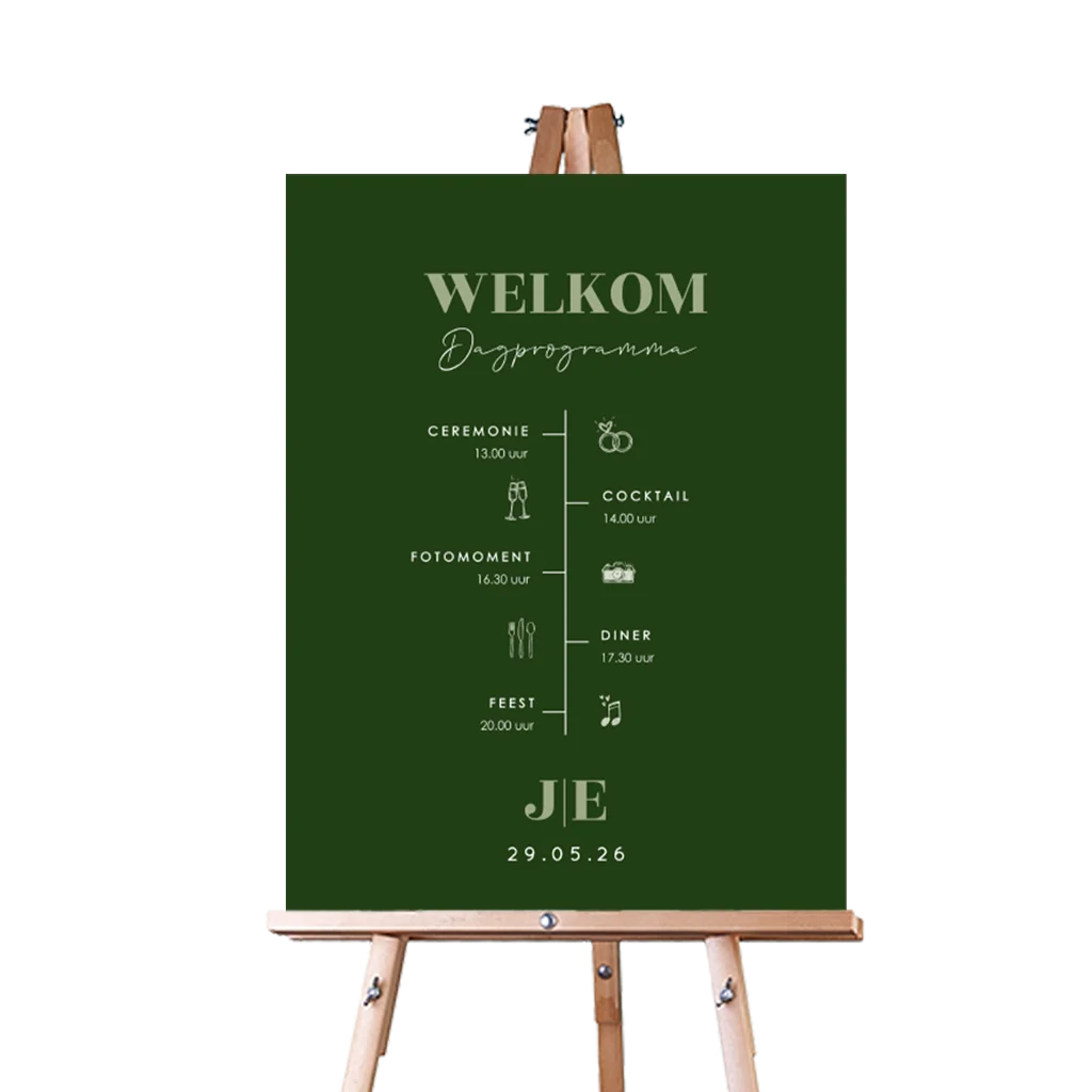 Typografisch welkomstbord bruiloft met dagprogramma in groentinten