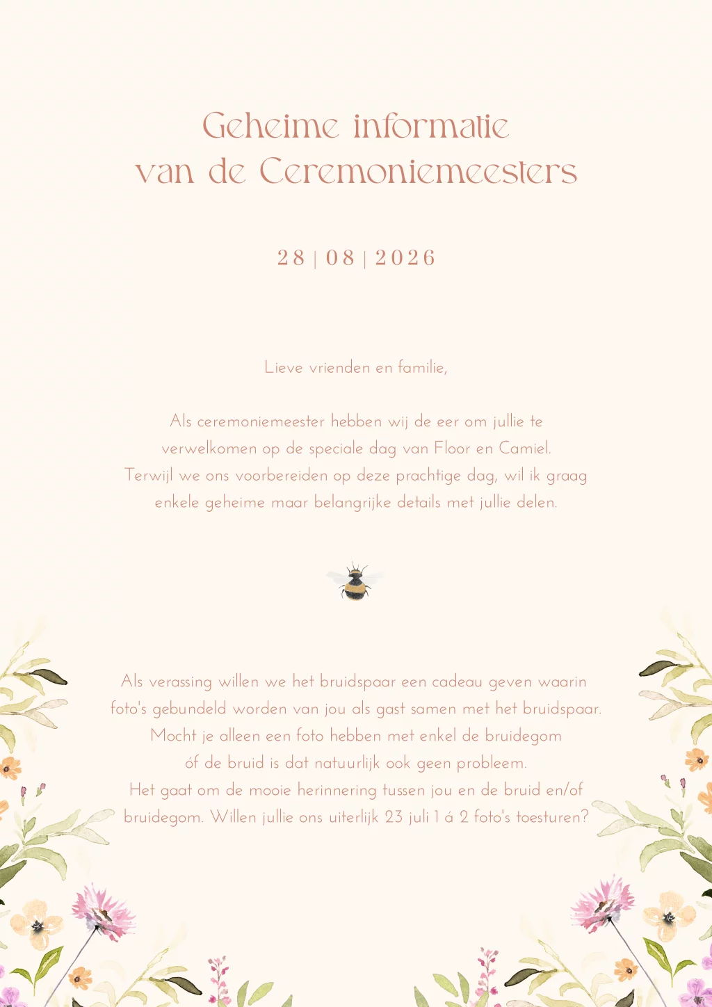 Deze ceremoniemeesterbrief maak je helemaal zelf en stuur je mee met de trouwkaart. Zo kun je de gasten goed voorbereiden op de grote dag!