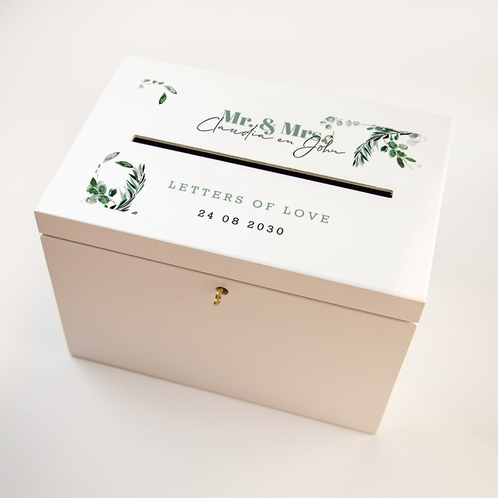 Bewaar de enveloppen op jullie bruiloft in deze prachtige enveloppendoos met planten! De kist is gemaakt van natuurlijk materiaal en heeft een messingkleurig sleuteltje.