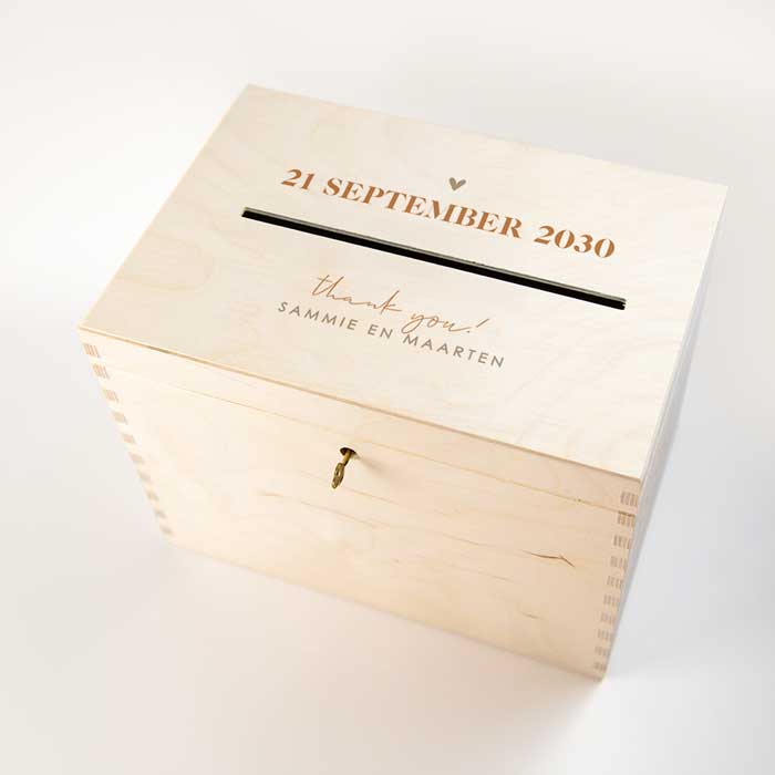 Bewaar de enveloppen op jullie bruiloft in deze prachtige enveloppendoos met trouwdatum! De kist is gemaakt van natuurlijk materiaal en heeft een messingkleurig sleuteltje.