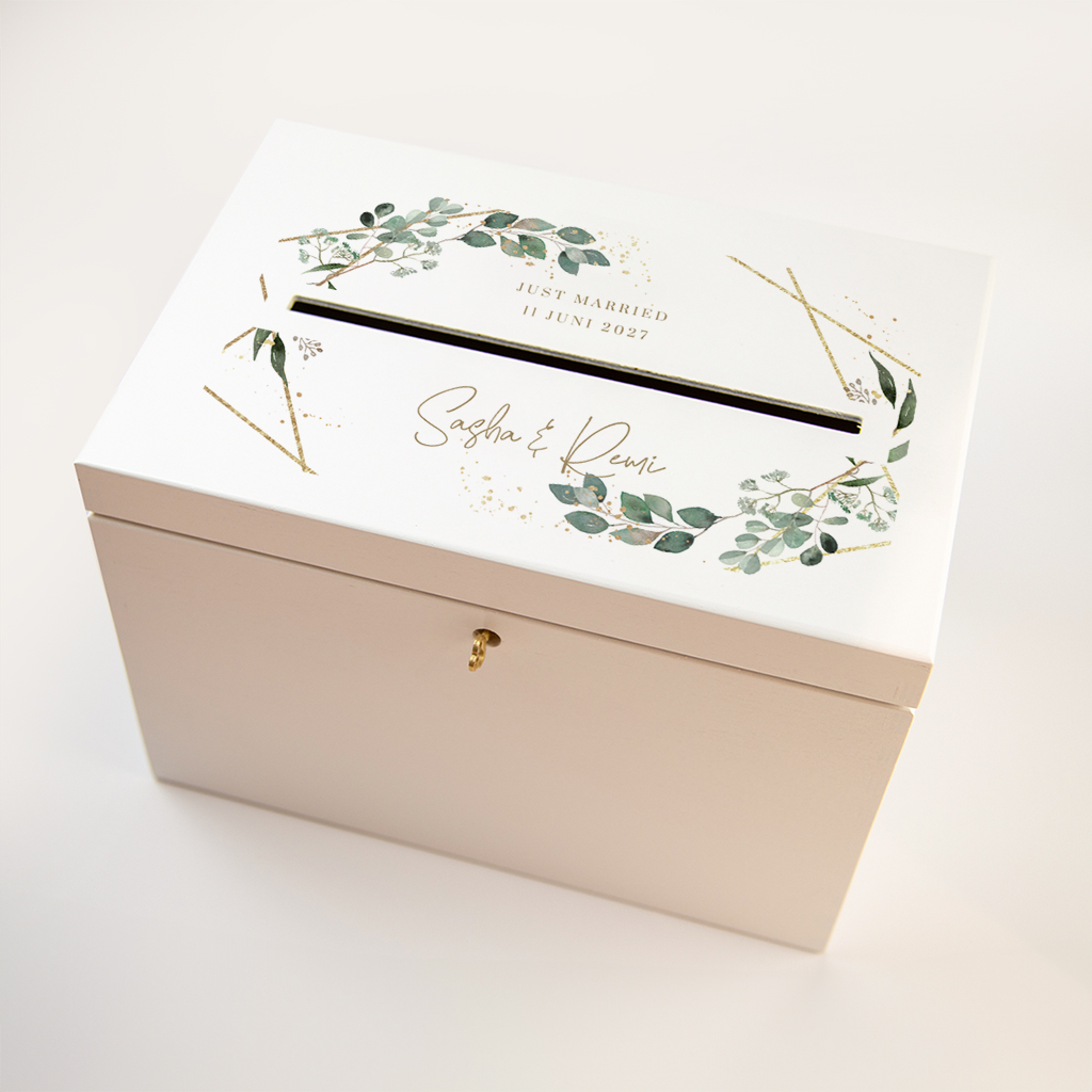 Enveloppenkist bruiloft botanisch met gouden details