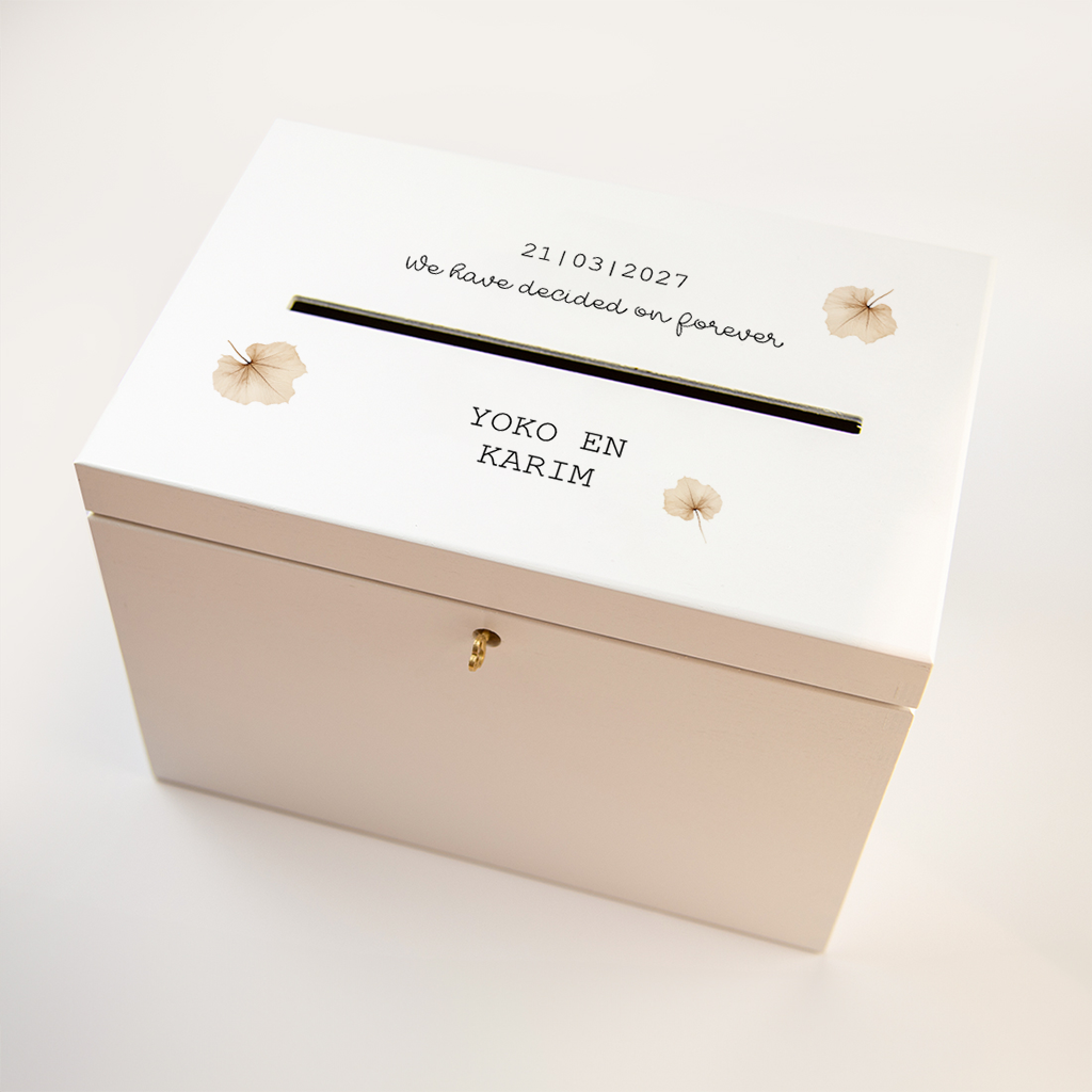 Hoe leuk is het om jullie enveloppen te bewaren in deze unieke enveloppendoos in dezelfde stijl als jullie trouwkaart?