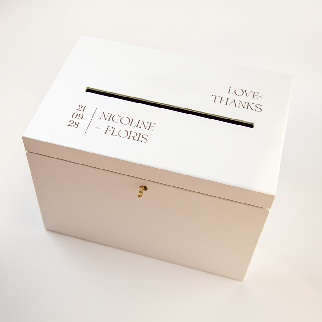 Op zoek naar een mooie doos om de enveloppen op jullie bruiloft in te bewaren? Deze witte houten enveloppendoos kun je geheel naar wens aanpassen met de online editor!