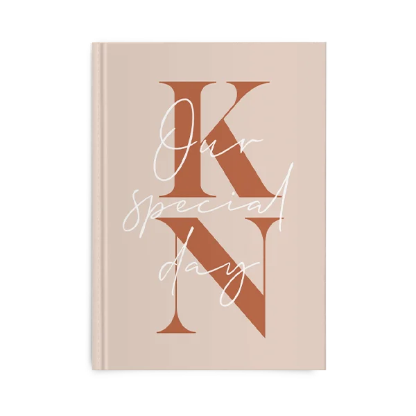 Ontwerp een gastenboek in stijl van jullie trouwkaart en maak een écht bewaaritem. Kies voor dit ontwerp met een prachtige beige kleur in combinatie met roestbruine letters.