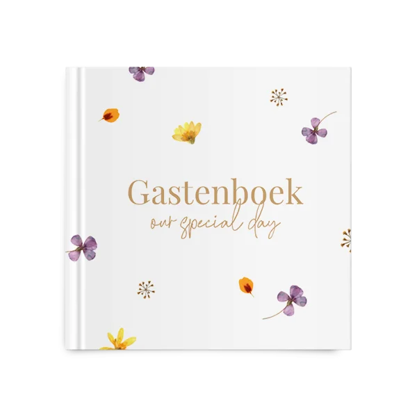Hoe mooi is een gastenboek in stijl van jullie trouwkaart? Het wordt op deze manier écht een bewaaritem. Dit gastenboek heeft prachtige droogbloemen.