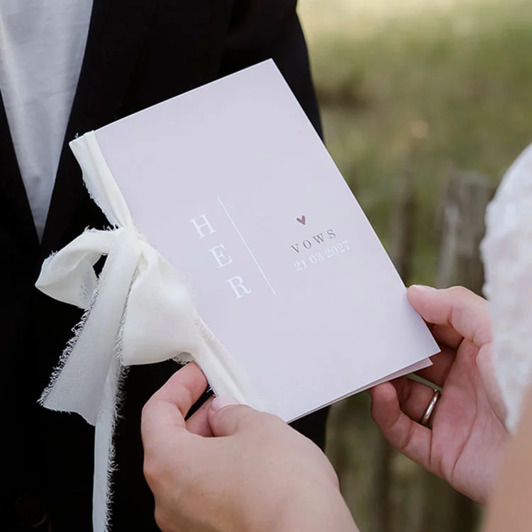 Wil je dat het uitspreken van je geloften vlekkeloos verloopt? Schrijf je geloften dan in dit boekje met zijden lint*. Personaliseer het boekje naar wens in de online editor.