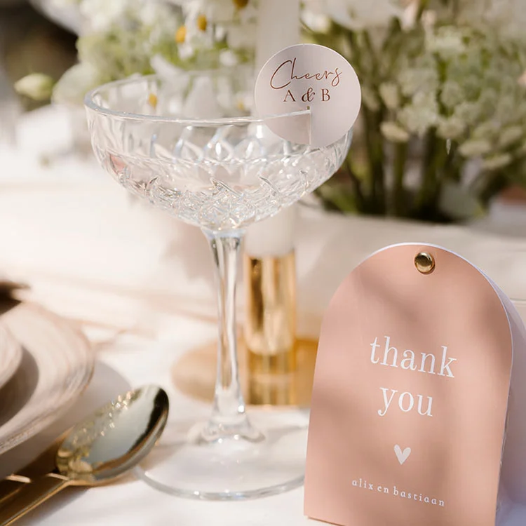 Maak jullie bruiloft helemaal compleet met deze zelf ontworpen glaslabels! Je schuift het label gemakkelijk aan het glas.