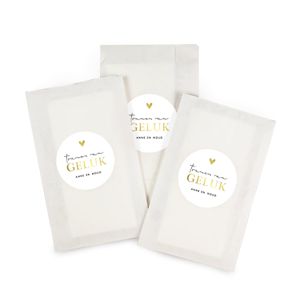 Plak deze happy tears stickers met goudfolie op een pakje zakdoekjes. Zo heb je een ontzettend leuk cadeautje voor jullie bruiloftsgasten.