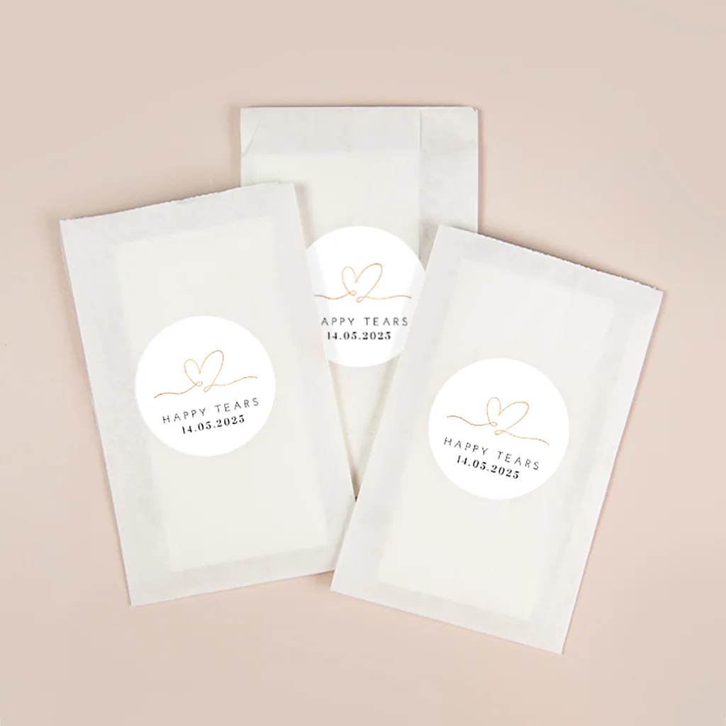Plak deze ontzettend leuke happy tears stickers op een pakje zakdoekjes. Zo heb je een ontzettend leuk cadeautje voor jullie bruiloftsgasten. Bewerk gemakkelijk in de editor.