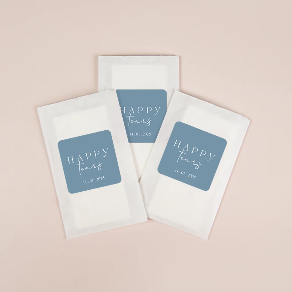 Plak deze stijlvolle happy tears stickers op een pakje zakdoekjes. Zo heb je gelijk een leuk cadeautje voor jullie bruiloftsgasten!