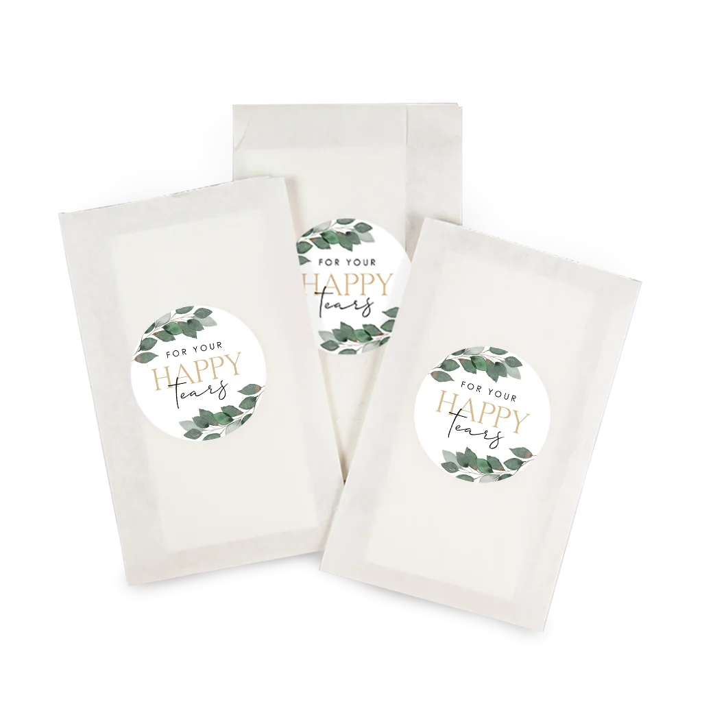 Plak deze ontzettend leuke happy tears stickers op een pakje zakdoekjes. Zo heb je een leuk cadeautje voor jullie bruiloftsgasten. Bewerk gemakkelijk in de editor.