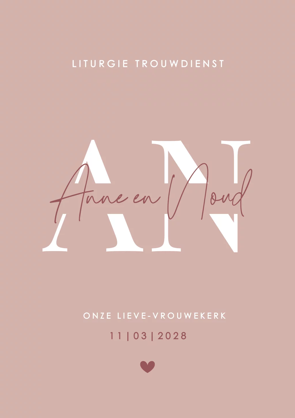 Met dit voorbeeld kun je zelf een liturgieboekje maken voor jullie trouwdienst. Op de roze voorkant staan de initialen met de namen er doorheen in hippe typografie, in dezelfde stijl als de trouwkaart. In de online editor vervang je de teksten door jullie persoonlijke tekst en pas je kleur en lettertype naar wens aan.
