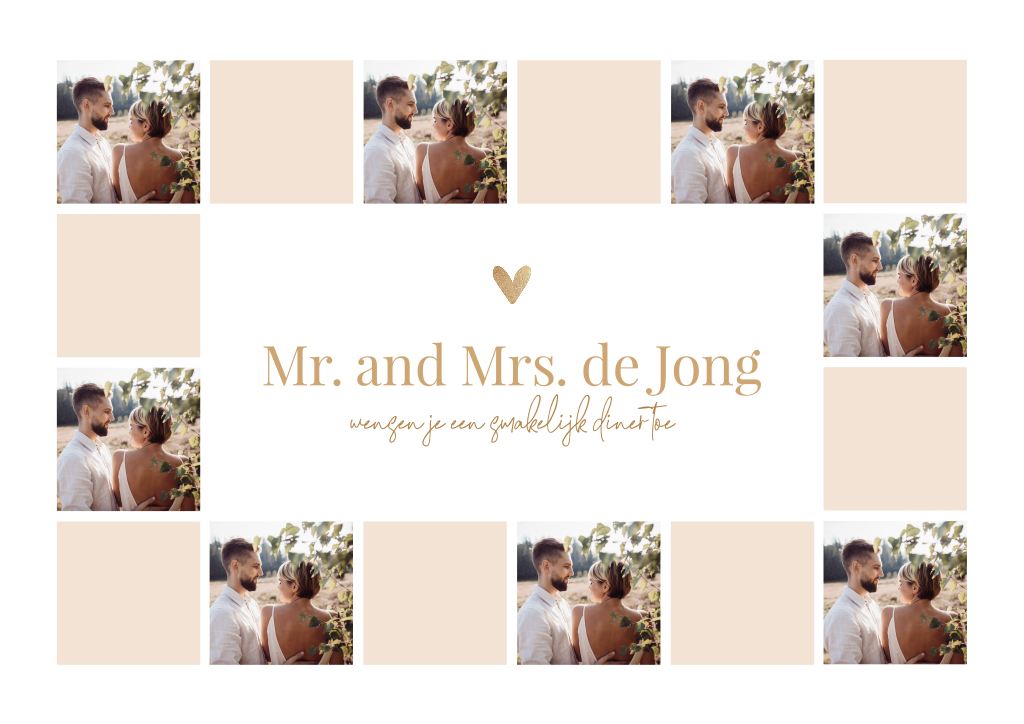Upload jullie mooiste foto's op deze placemat, zo heb je een persoonlijk element op de feestelijk gedekte tafel. De fotovlakken zijn afgewisseld met lichtroze vlakken, in het midden de namen met een hartje erboven, romantisch! Maak de tafelsetting van jullie bruiloft hiermee compleet, naast o.a. de menukaarten en naamkaartjes op de dinertafel.
