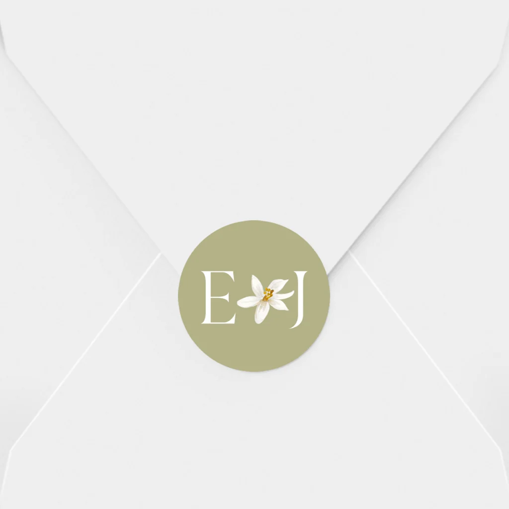 Maak een feestje van jullie trouwpost met deze zomerse olijfgroene sluitsticker met citroen bloesem!