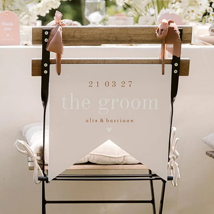 Versier de stoel van de bruidegom met dit stoelbordje in neutrale kleuren! Rijg een mooi lint of touw door de voorgeperforeerde gaatjes en gebruik het bordje als stoel versiering tijdens het diner.
