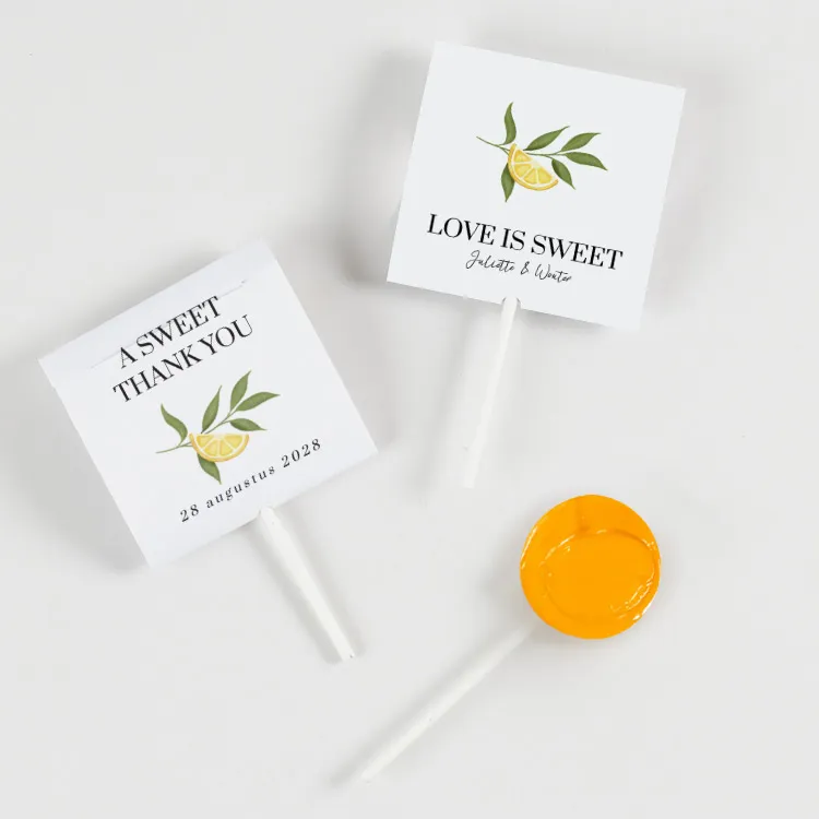 Verras de gasten op jullie bruiloft met dit zoete trouwbedankje! Deze lollyhoesjes met citroentje kun je geheel naar smaak aanpassen in de online editor. Thuis hoef je de hoesjes alleen nog om een lolly heen te vouwen.