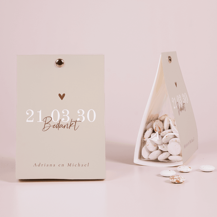 Personaliseer de buitenzijde van het snoepzakje en bestel meteen de zakjes en splitpen mee, om de bedankjes compleet te maken. Je hoeft enkel de snoepjes nog zelf uit te zoeken en het geheel in elkaar te zetten. Zo’n leuk bedankje na jullie bruiloft!