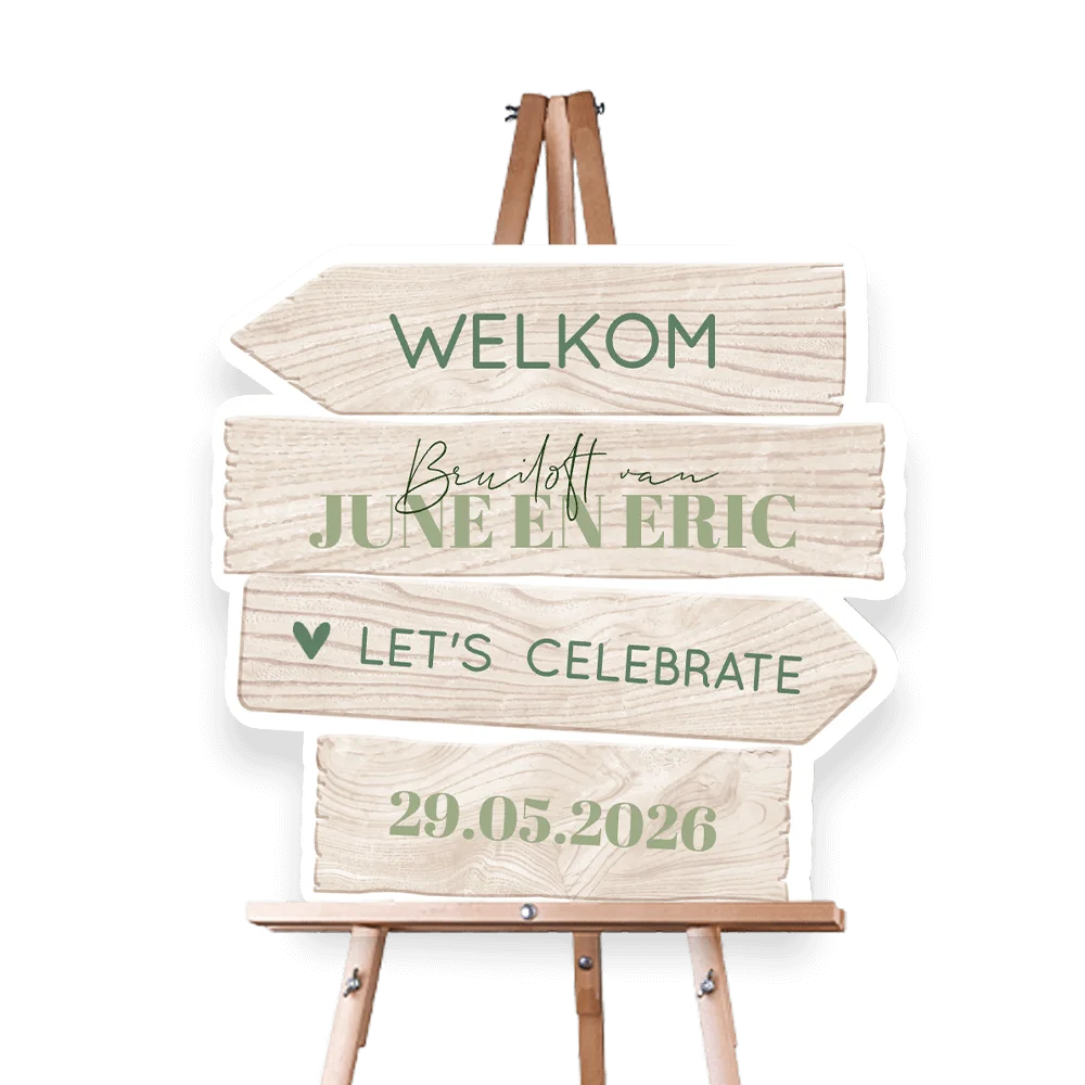 Verwelkom jullie gasten met dit persoonlijke welkomstbord in de vorm van een wegwijzer. Pas kleuren en typografie naar eigen wens aan! Zet dit bord op een schildersezel óf bevestig hem aan een houten paal.