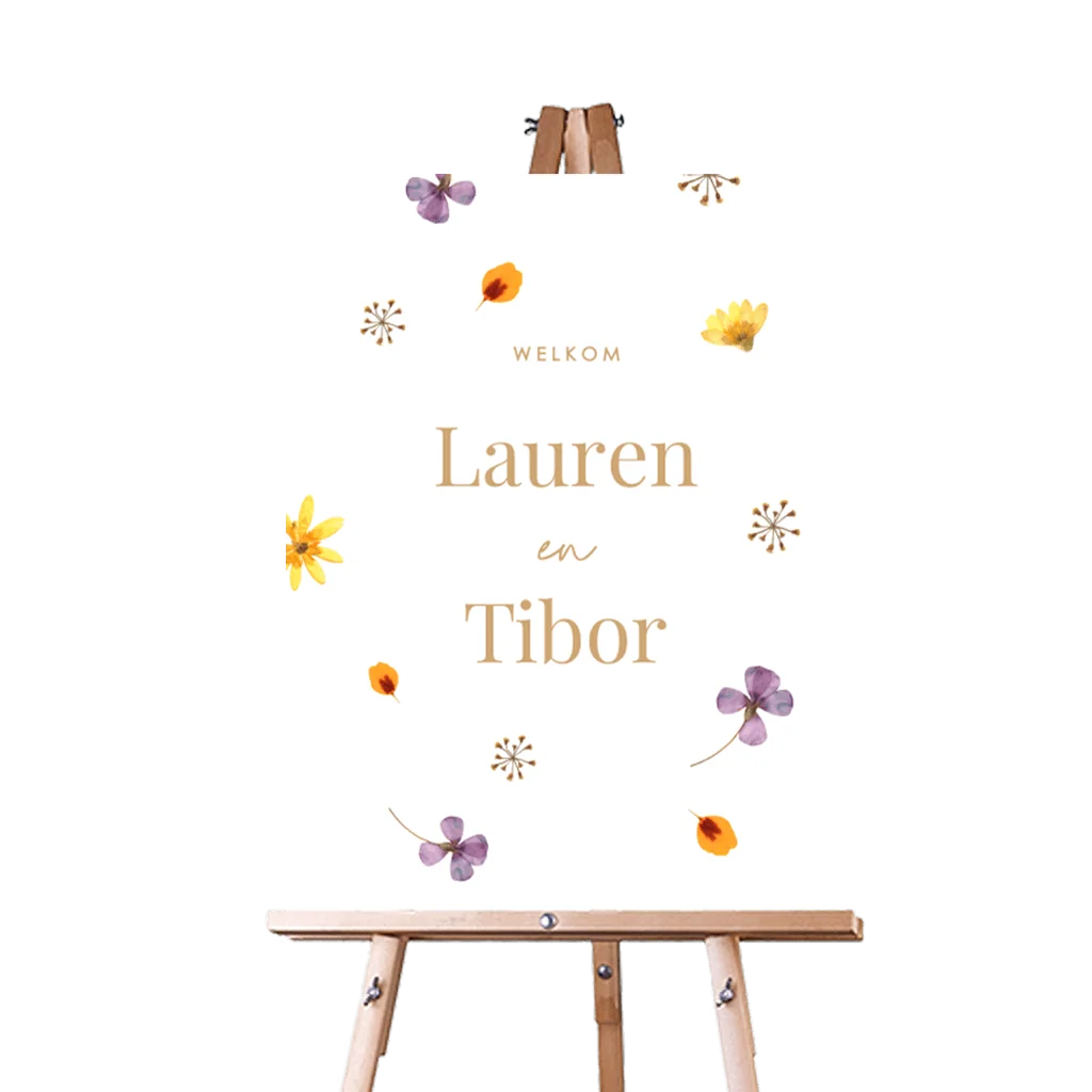Dit bruiloftsbord is ontzettend vrolijk en perfect voor een zomerse bruiloft of een bruiloft die in de lente plaatsvindt. De geperste bloemen zijn handmatig toegevoegd en maken dit welkomstbord ontzettend uniek.