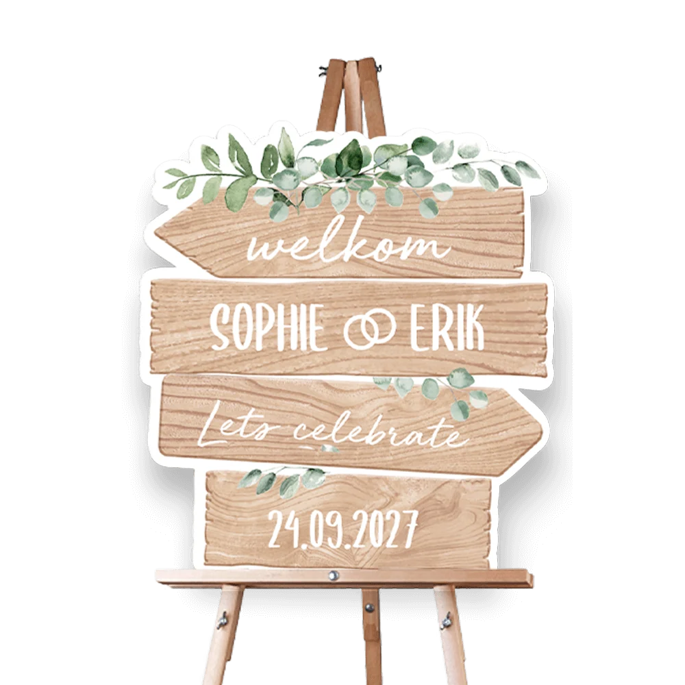 Verwelkom jullie gasten met dit persoonlijke welkomstbord in de vorm van een wegwijzer.Zet dit bord op een schildersezel óf bevestig hem aan een houten paal.