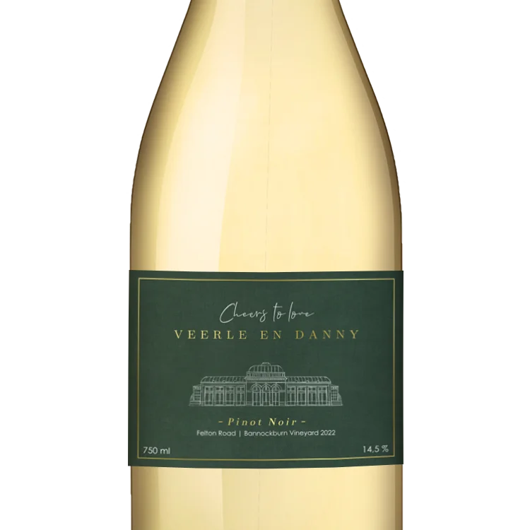 Een wijnetiket in de stijl van jullie trouwkaart, hoe bijzonder! Pas dit etiket gemakkelijk aan naar jullie smaak in de editor. Voeg eventueel tekst en andere elementen - ook in goudfolie - toe. Zo maak je het wijnetiket helemaal eigen.