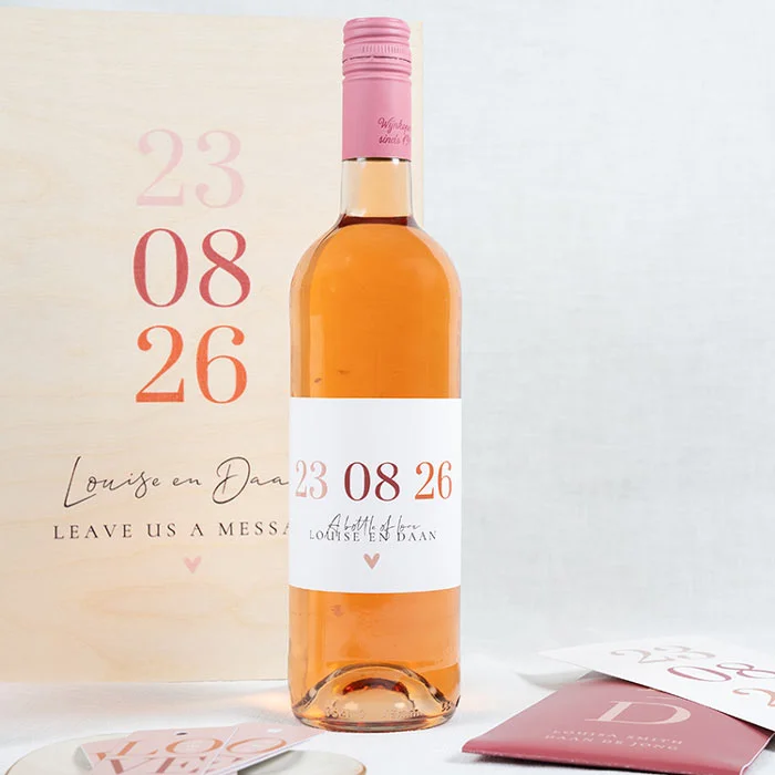 Een wijnetiket in de stijl van jullie trouwkaart, hoe leuk! Pas dit etiket gemakkelijk aan naar jullie smaak in de editor. Voeg eventueel tekst en andere elementen - ook in goudfolie - toe. Zo maak je het wijnetiket helemaal eigen.