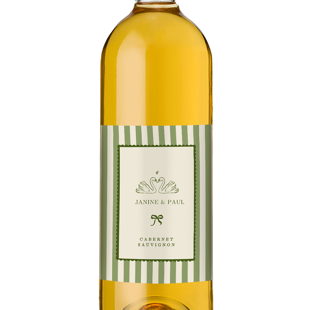Wijnetiket bruiloft groen strepenpatroon met zwanen - per 5 stuks