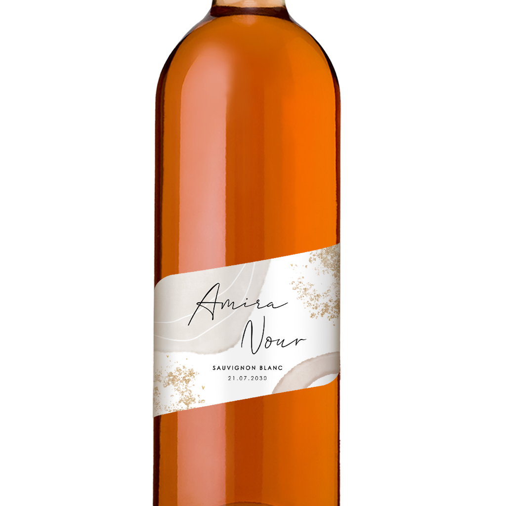 Een wijnetiket in de stijl van jullie trouwkaart, hoe bijzonder! Pas dit etiket gemakkelijk aan naar jullie smaak in de editor. Voeg eventueel tekst en andere elementen - ook in goudfolie - toe. Zo maak je het wijnetiket helemaal eigen.