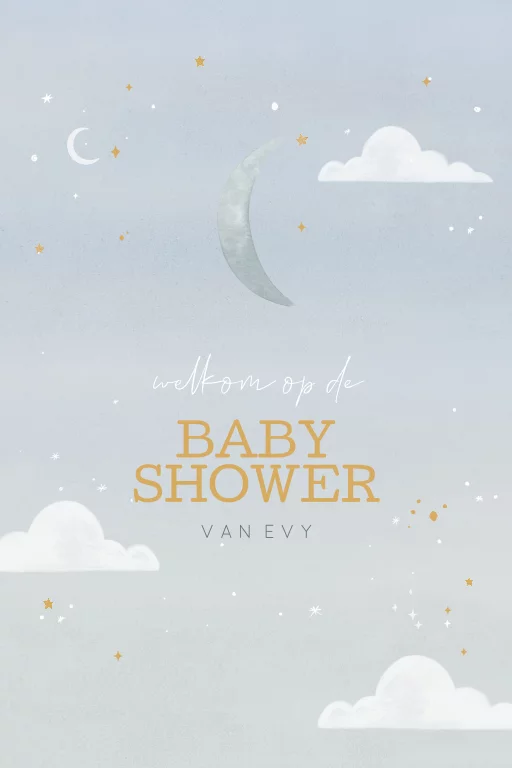 Dromerig welkomstbord babyshower met wolken, sterren en maan