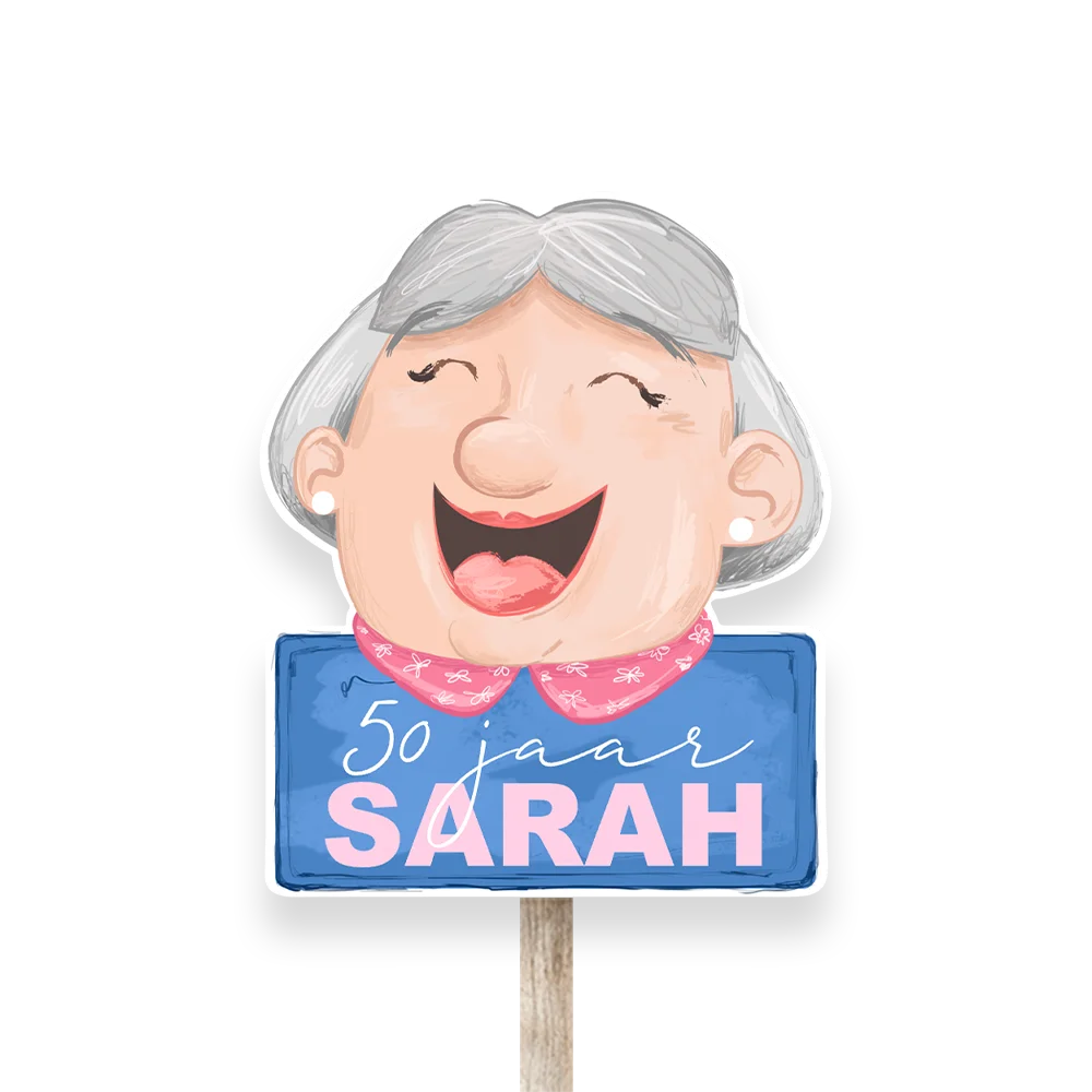 Vrolijk bord voor in de tuin om de verjaardagsgasten van een 50-jarige Sarah te verwelkomen. Het feest kan beginnen!