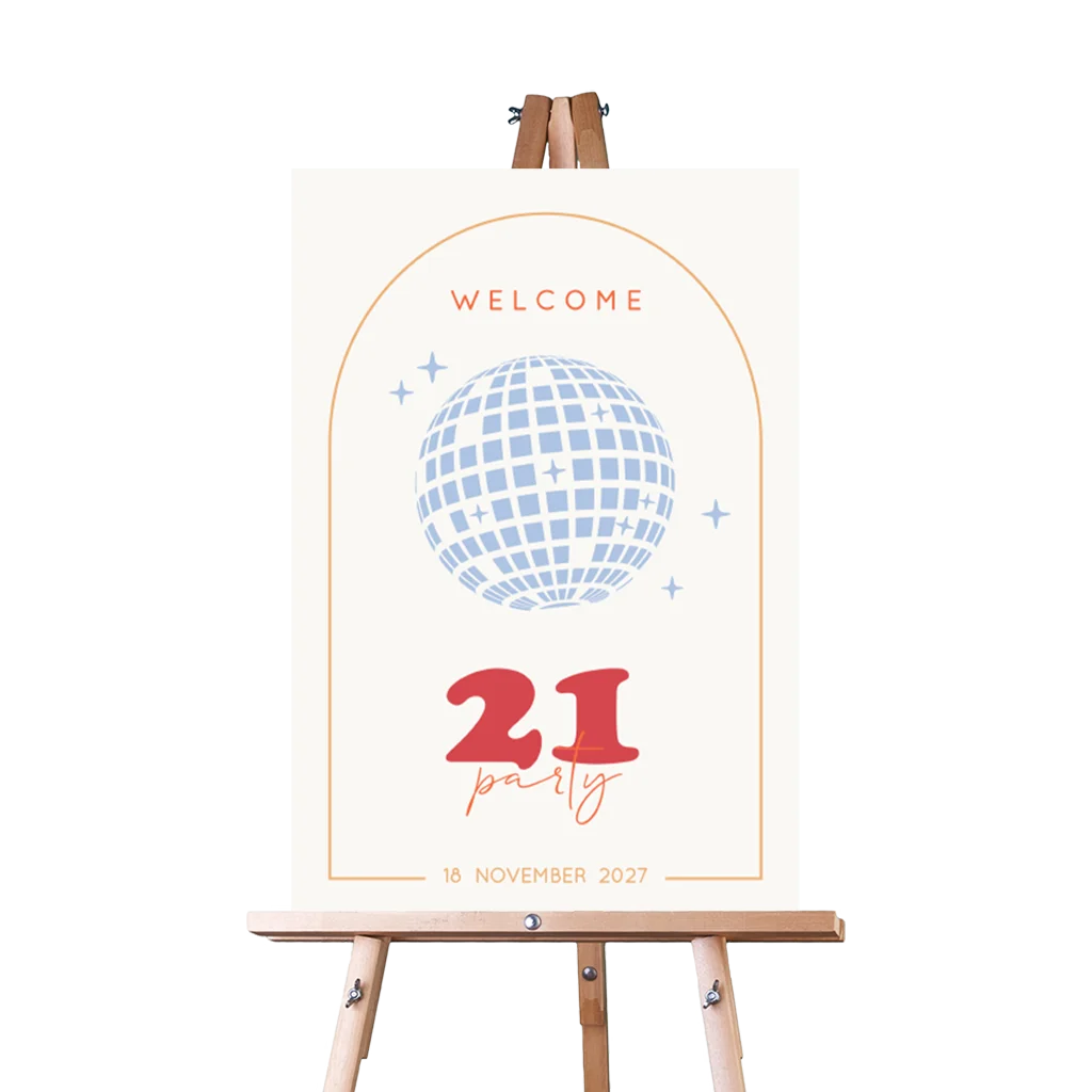 Verwelkom alle dancing queens op je 21 diner met dit groovy welkomstbord met discobal!
