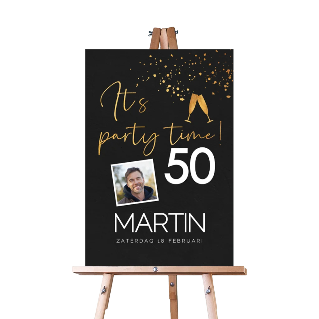 Jouw vijftigste verjaardag mag gevierd worden! Verwelkom de gasten van het feest met dit stijlvolle welkomstbord. Het bord wordt gedrukt op het materiaal forex van 5 mm dik. Dit is een stevig, weerbestendig materiaal dat geschikt is voor op bijvoorbeeld een schildersezel.