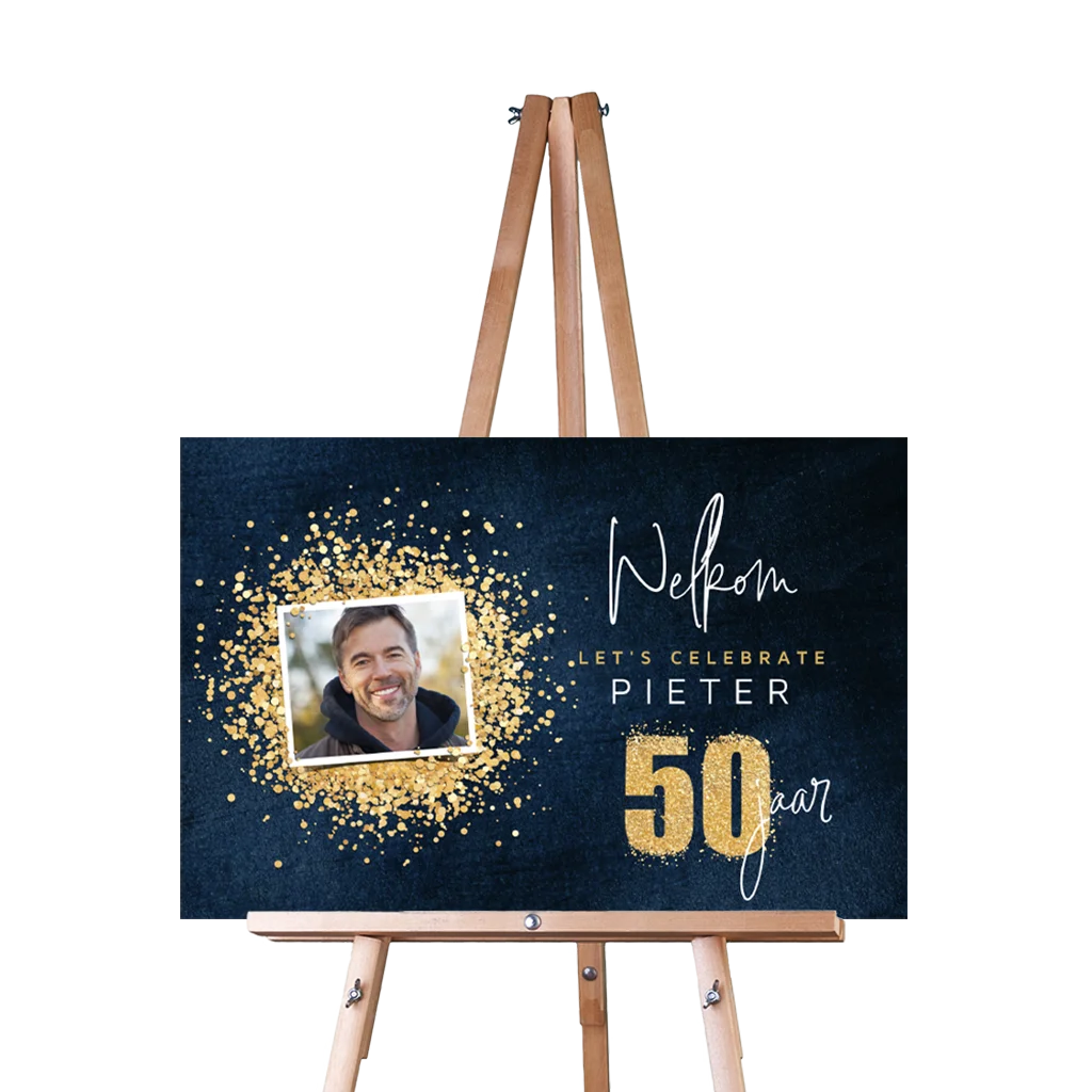 Welkomstbord blauw met goud en foto