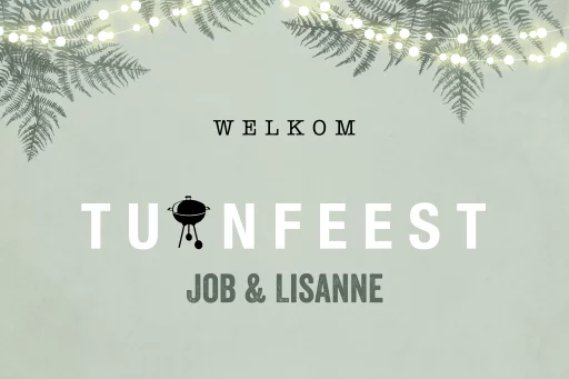 Welkomstbord voor tuinfeest met bladeren en lampjes