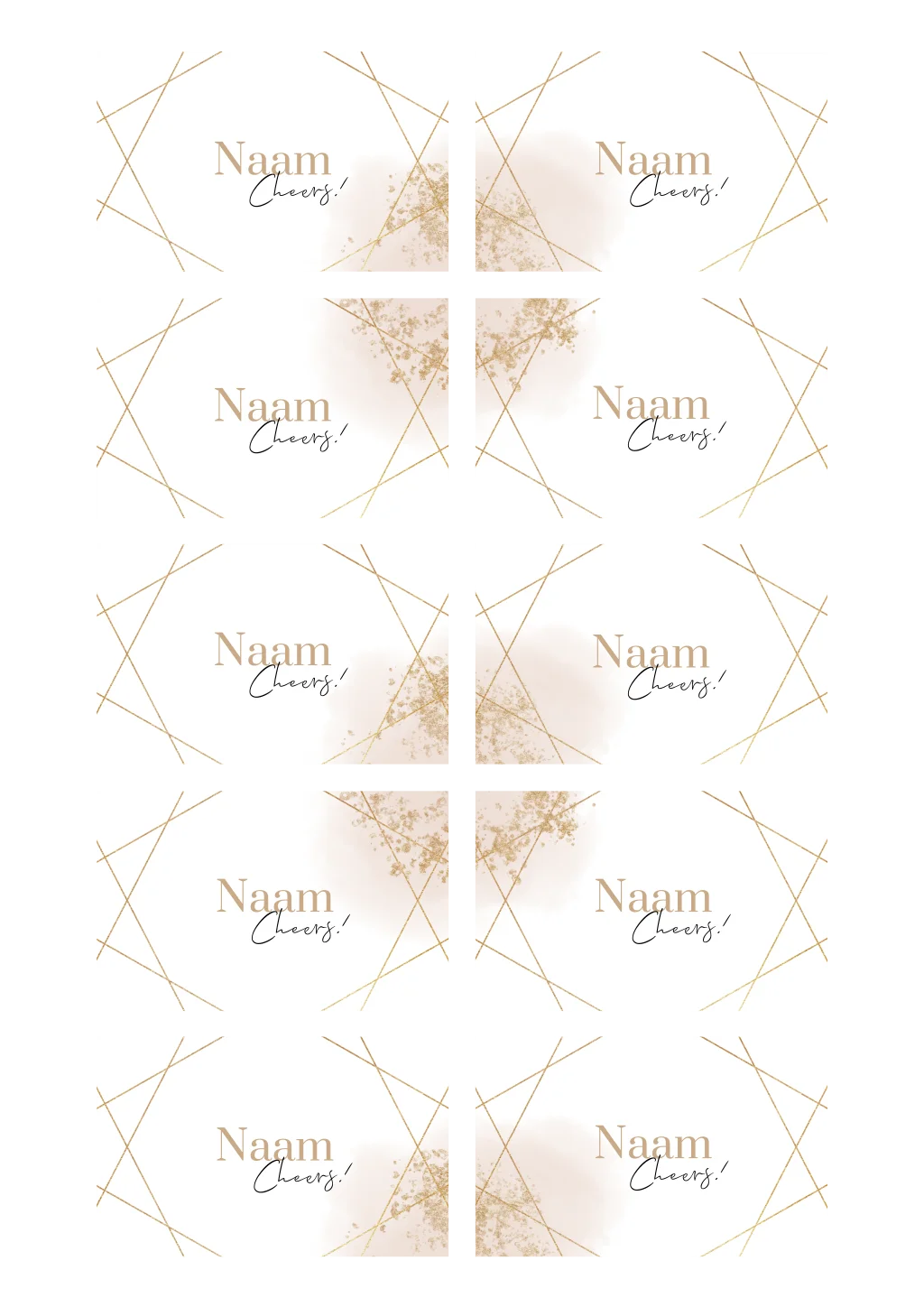 Stijlvol naamkaartje passend bij je 21 diner uitnodiging, mooi met gouden spetters en geometrische lijnen. Pas de kleuren en lettertypes naar wens aan in de editor en bestel dit kaartje op het formaat 8x5 cm.