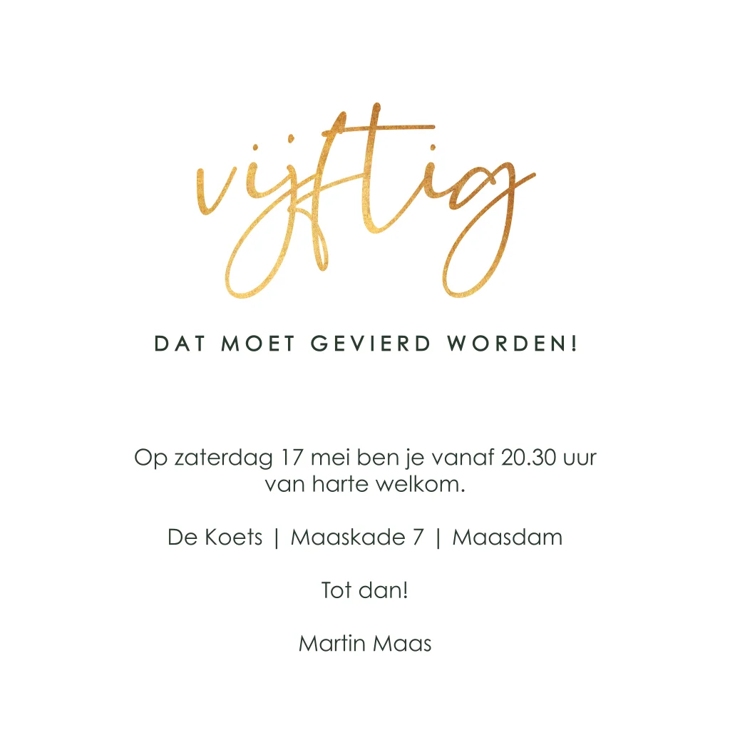 Je 50e verjaardag mag gevierd worden! Kies voor deze verjaardagsuitnodiging in donkergroen met goud look tekst.